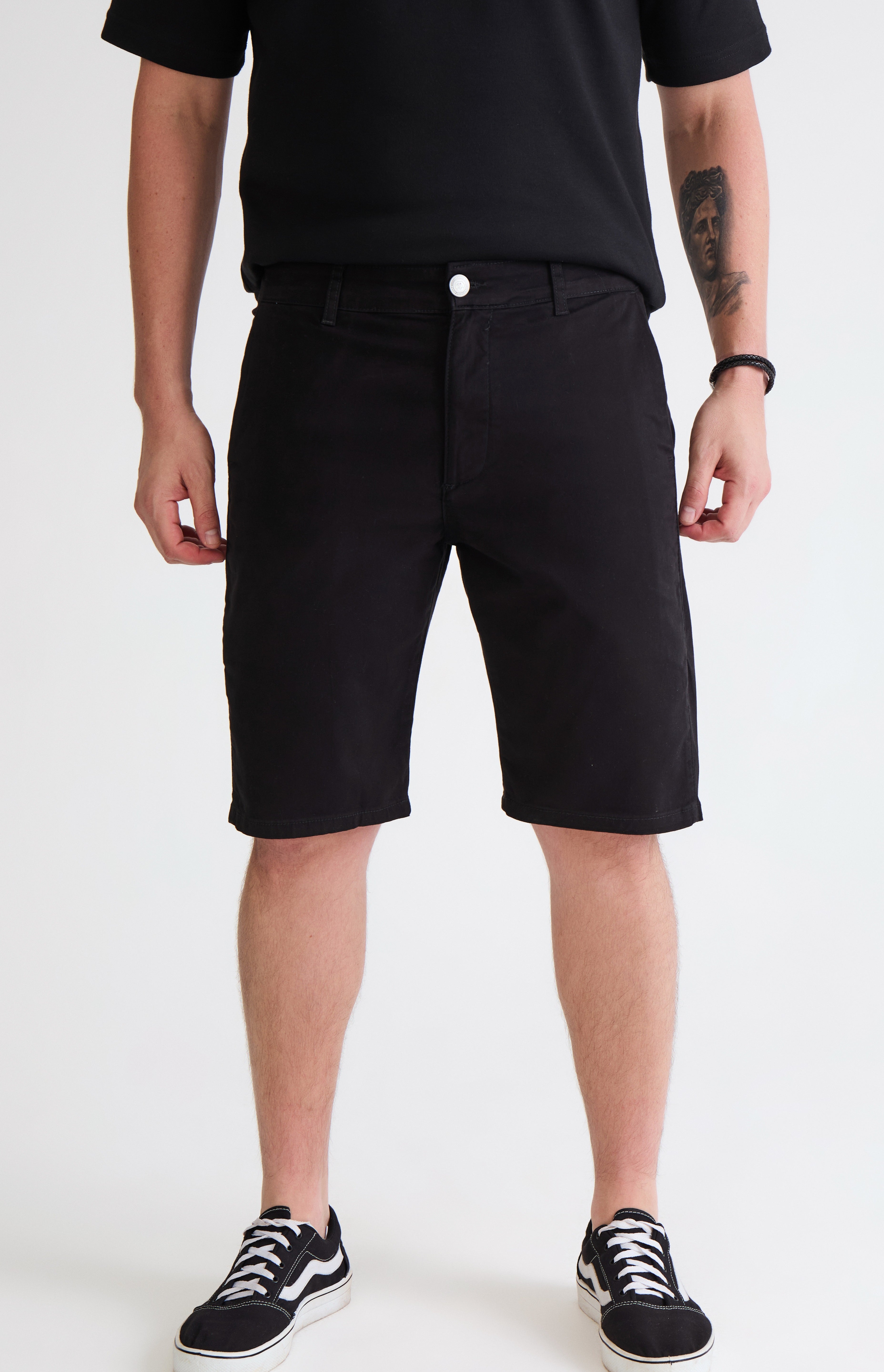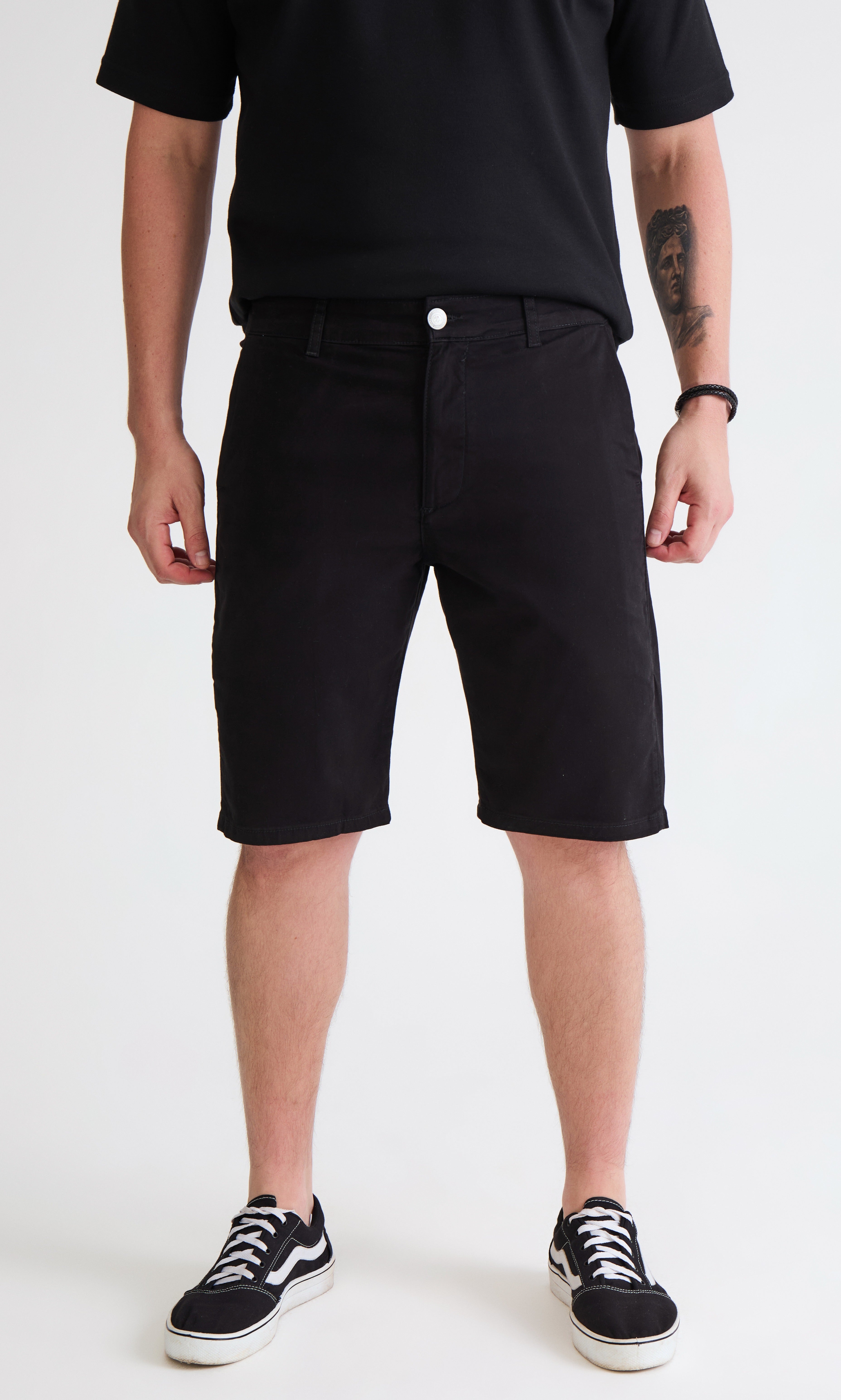 Na cor preta, possui abotoamento frontal e passantes para cinto, permitindo um ajuste seguro e prático. O comprimento clássico acima do joelho proporciona o equilíbrio ideal entre conforto e um visual moderno para o dia a dia. É a escolha perfeita para composições urbanas que pedem uma peça robusta e cheia de estilo