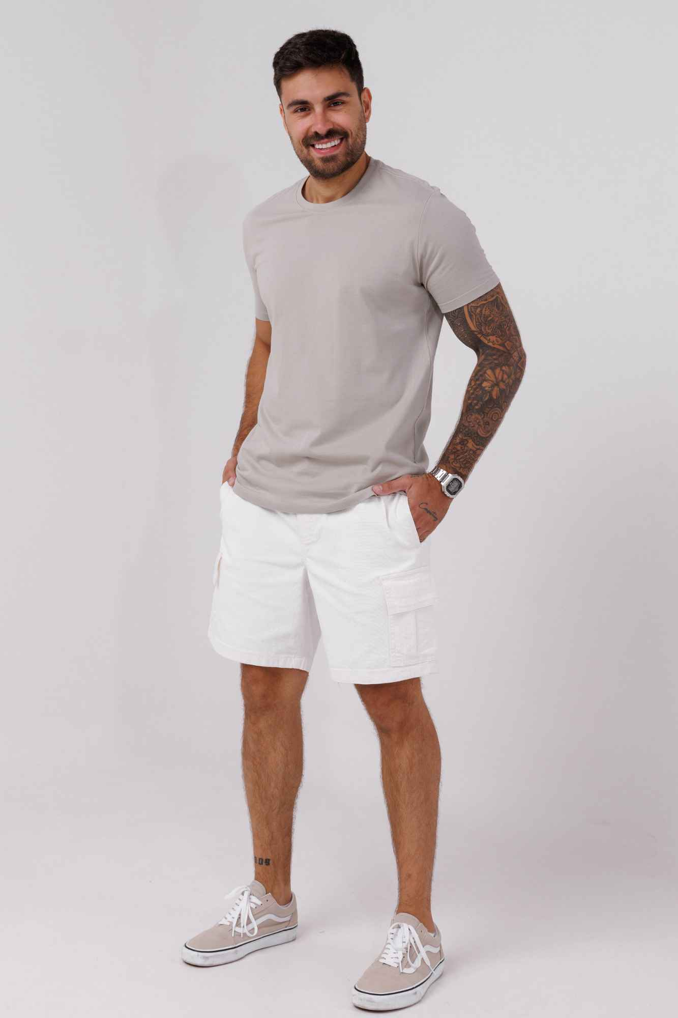 A bermuda cargo masculina é perfeita para quem busca praticidade e estilo no dia a dia. Confeccionada em sarja, a peça possui modelagem reta que garante conforto e liberdade de movimento. O cós com elástico proporciona ajuste ideal, enquanto os bolsos frontais, laterais no estilo cargo e um bolso posterior oferecem espaço extra para carregar seus itens essenciais.