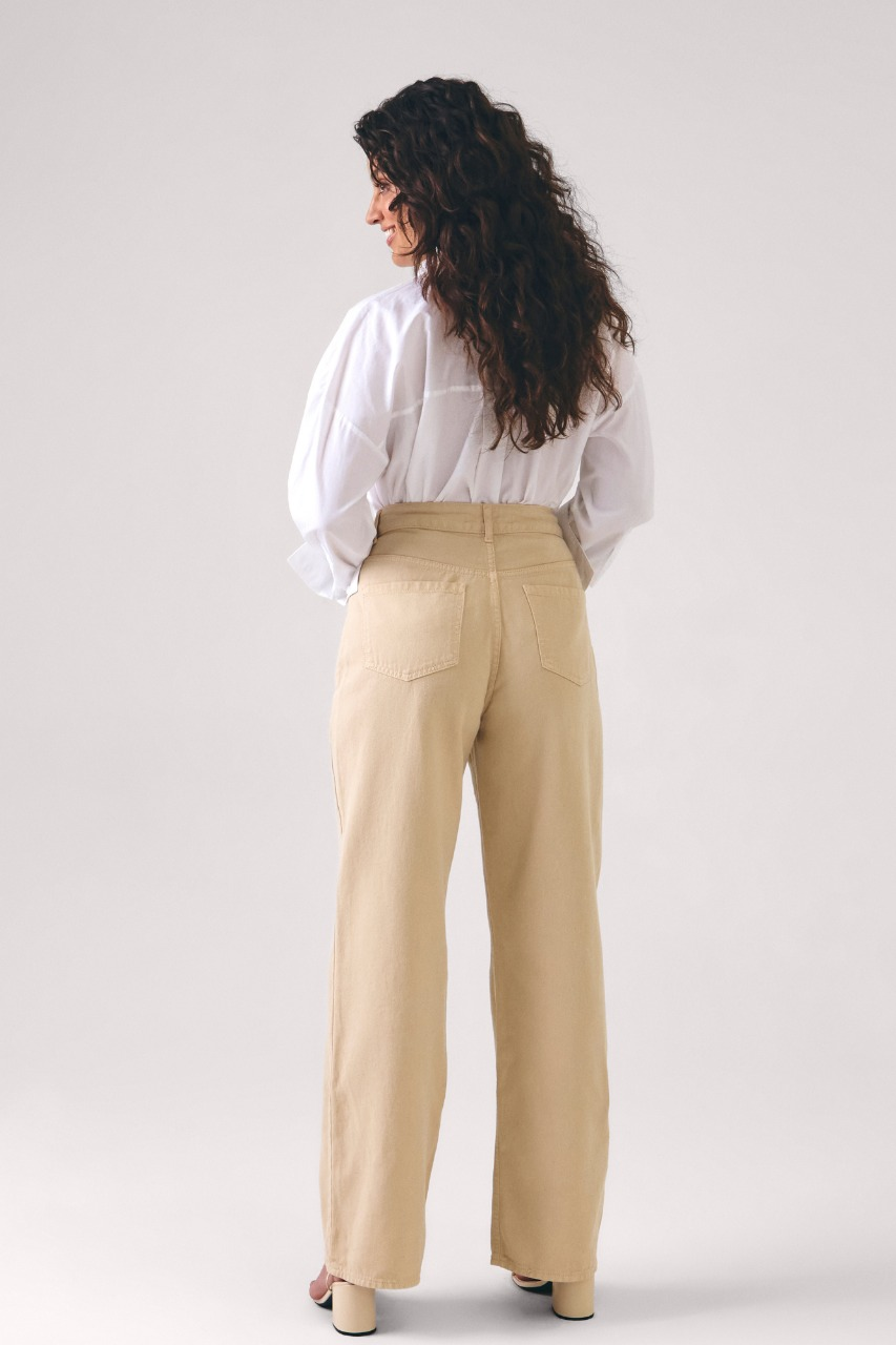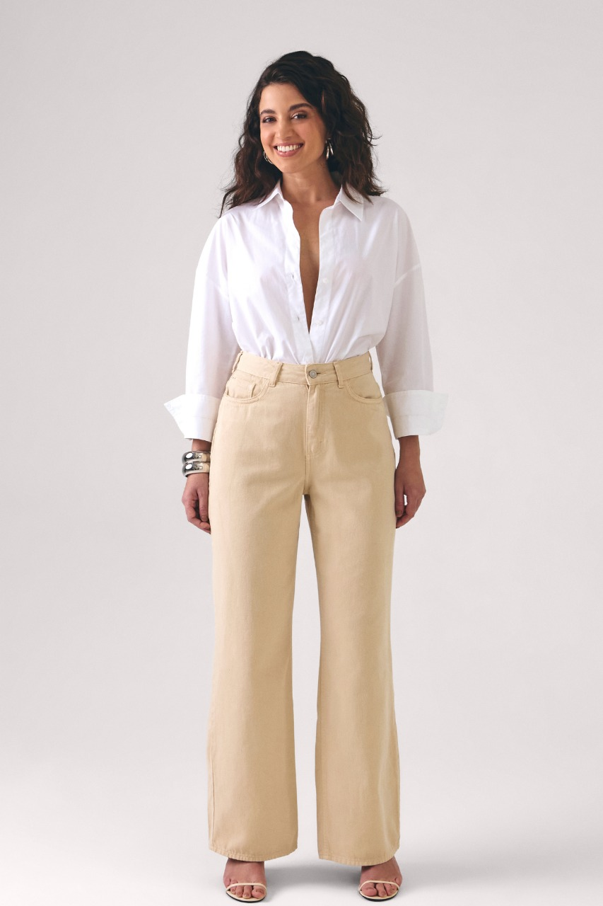 Na cor areia, a calça é neutra e versátil, combinando facilmente com camisas, croppeds ou blusas leves para criar produções casuais ou elegantes. A modelo veste tamanho 36, referência que auxilia na escolha do caimento ideal.