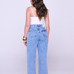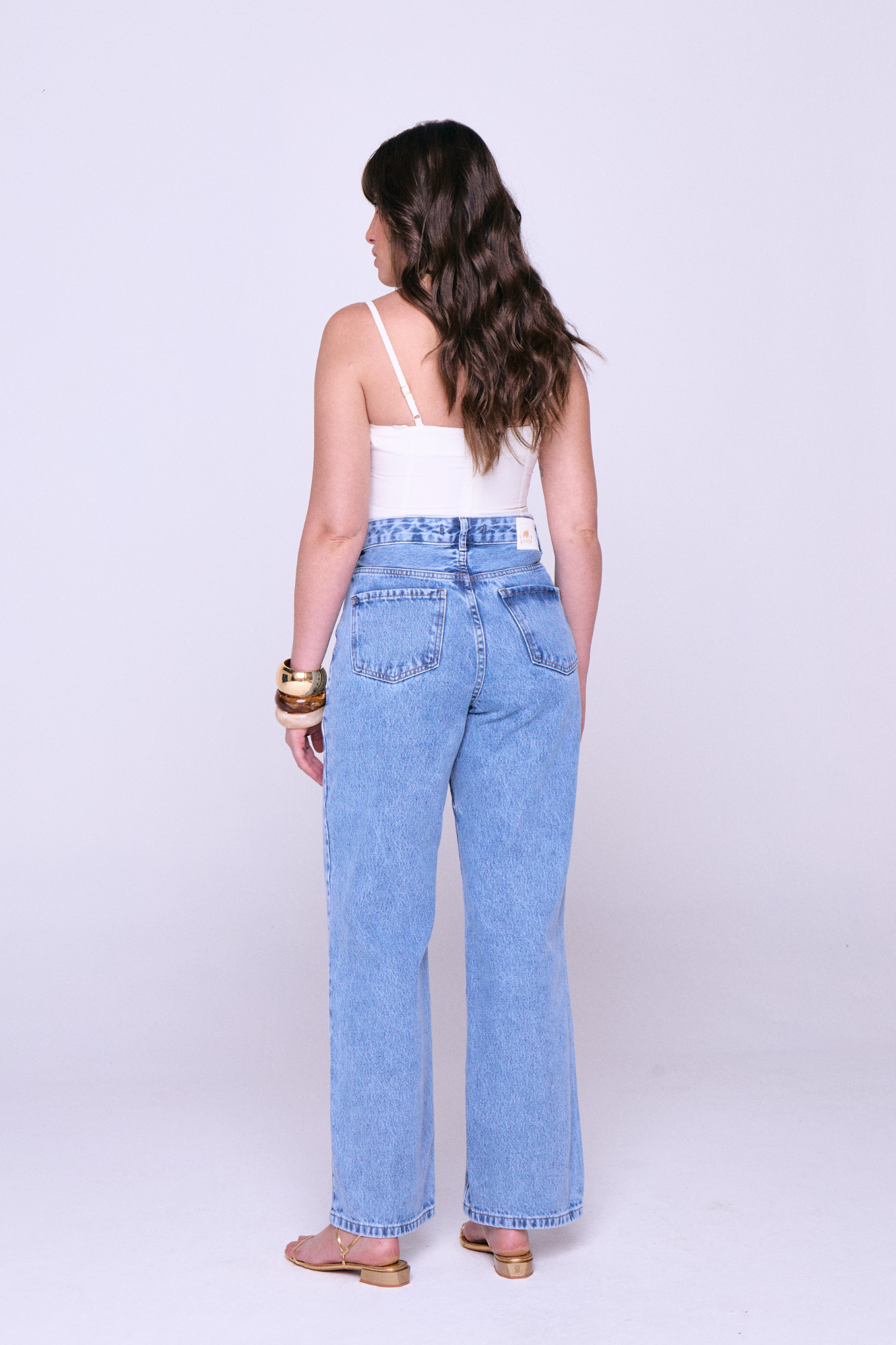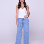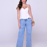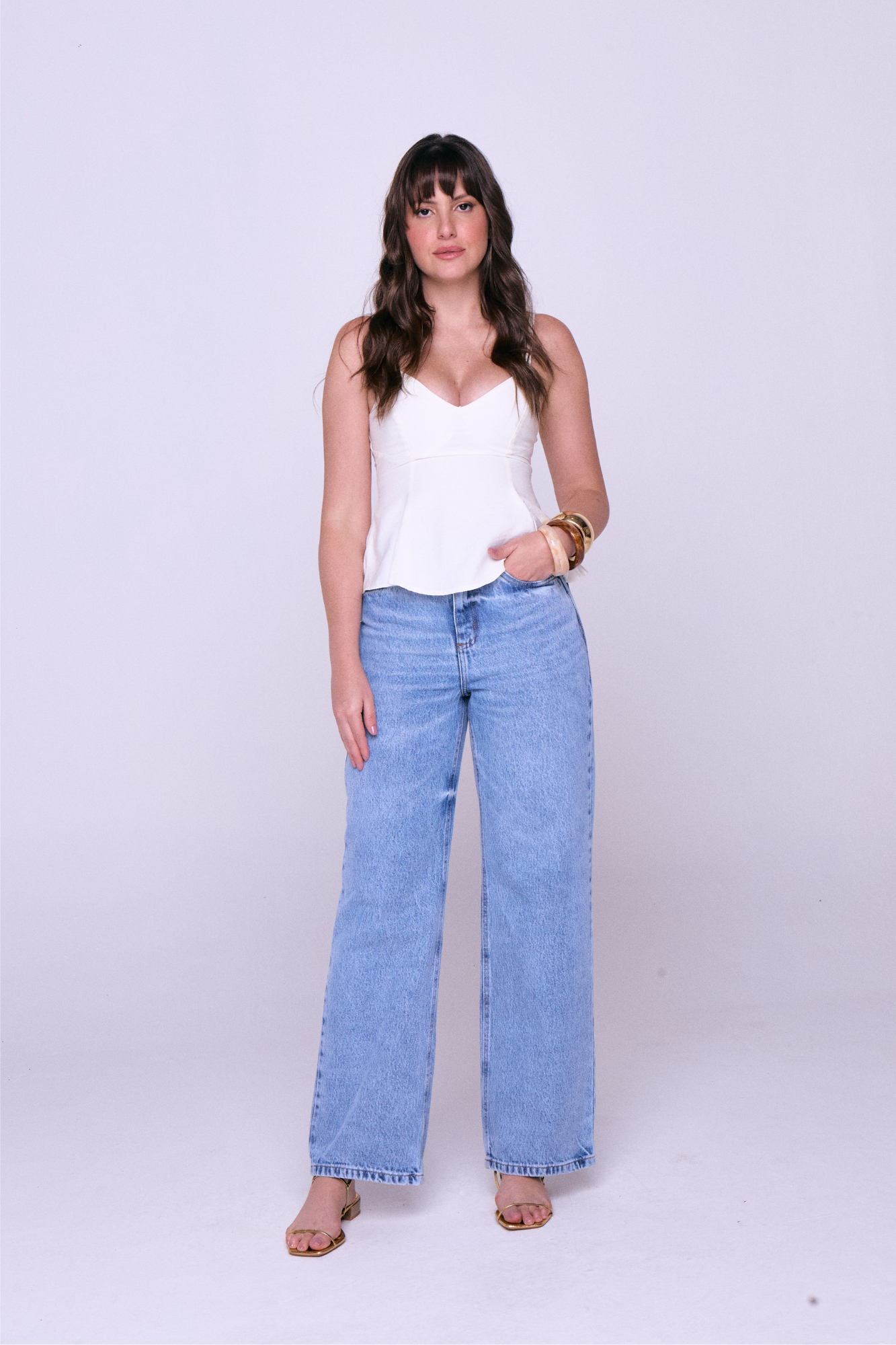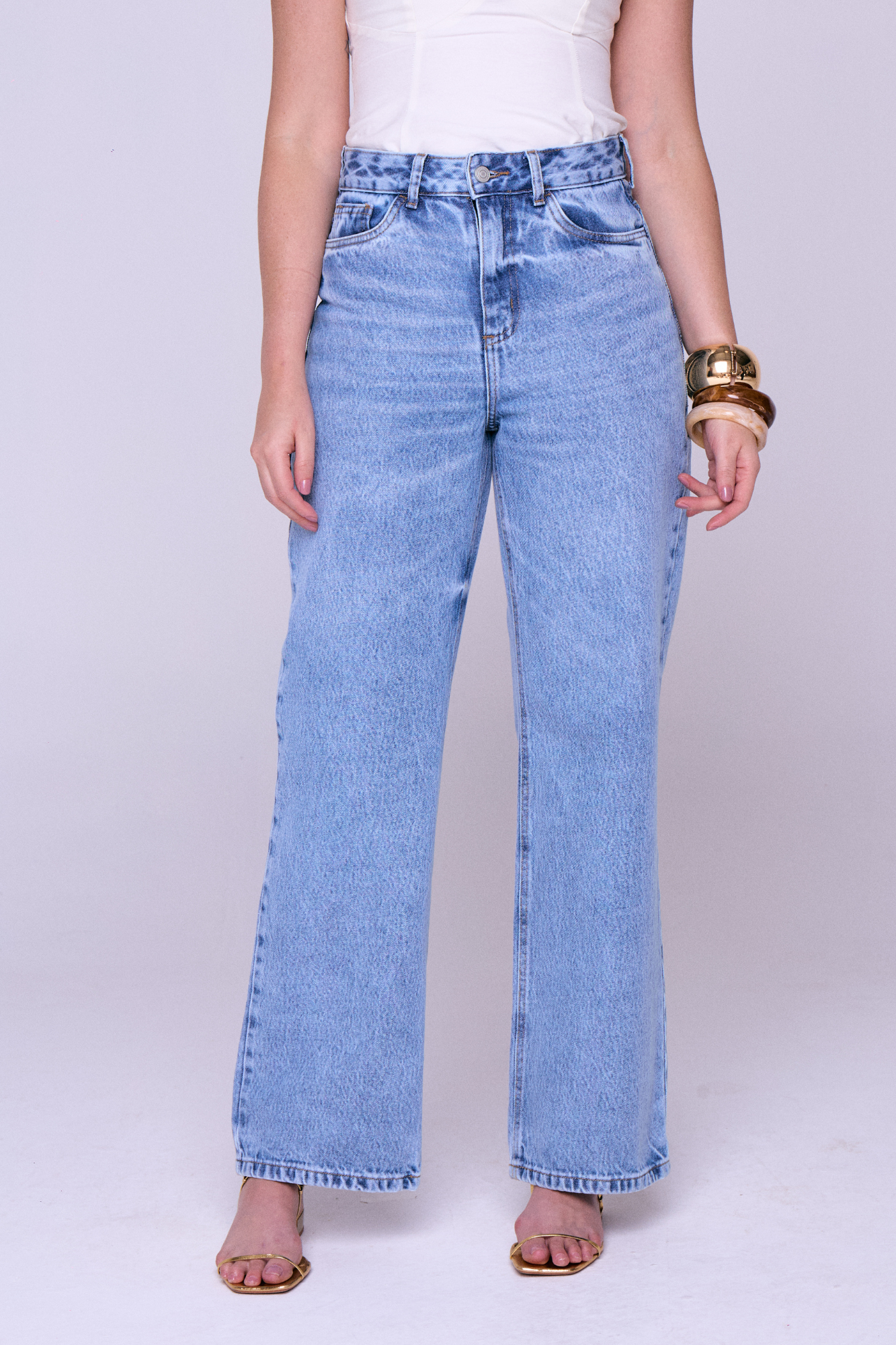 Calça jeans feminina wide leg Marine em lavagem clara com efeito bigode na parte frontal. Cintura alta e modelagem ampla que alonga a silhueta e garante conforto. Peça moderna e versátil para compor looks estilosos em qualquer ocasião.
