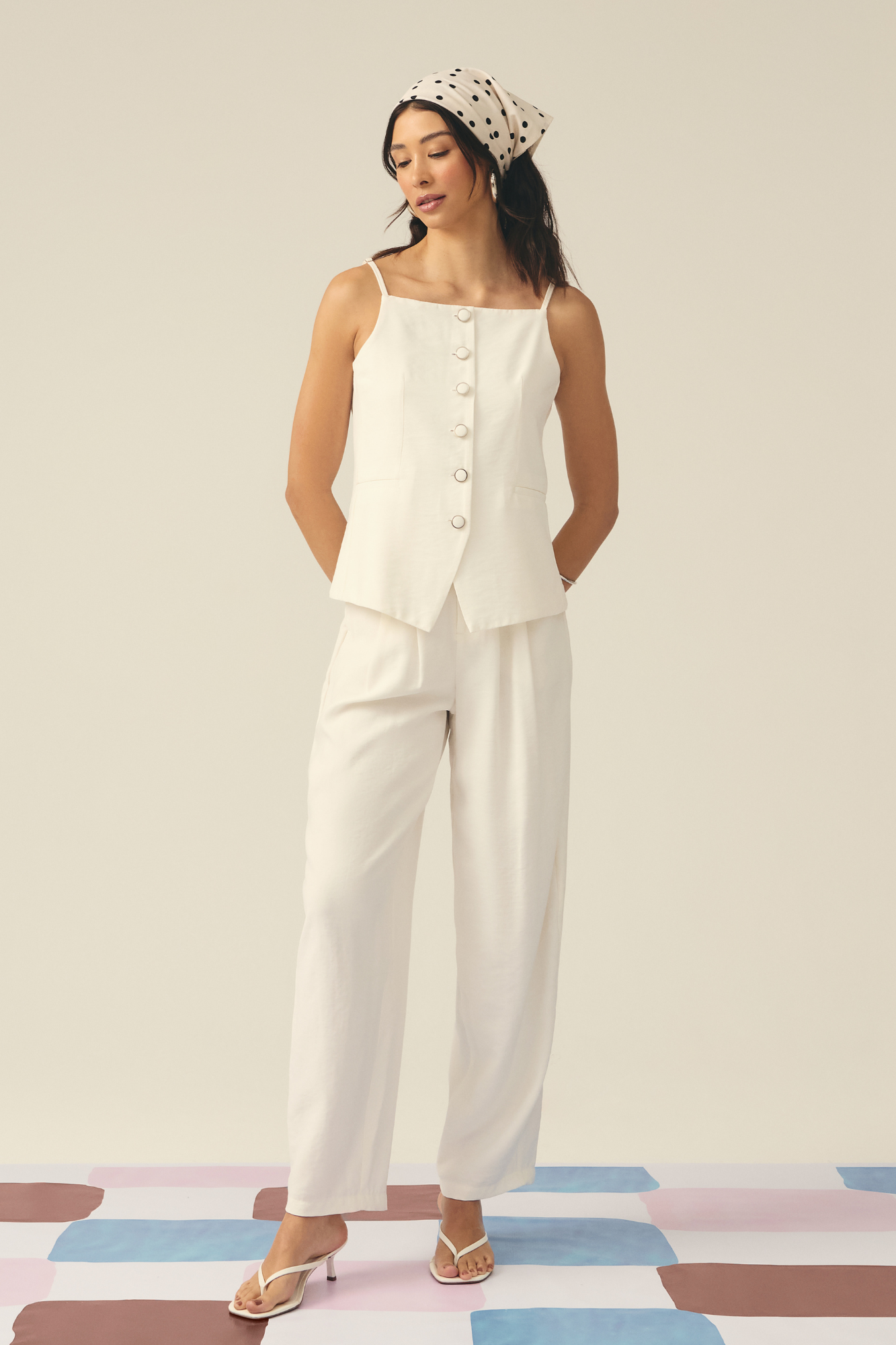 • Cintura alta com pregas frontais