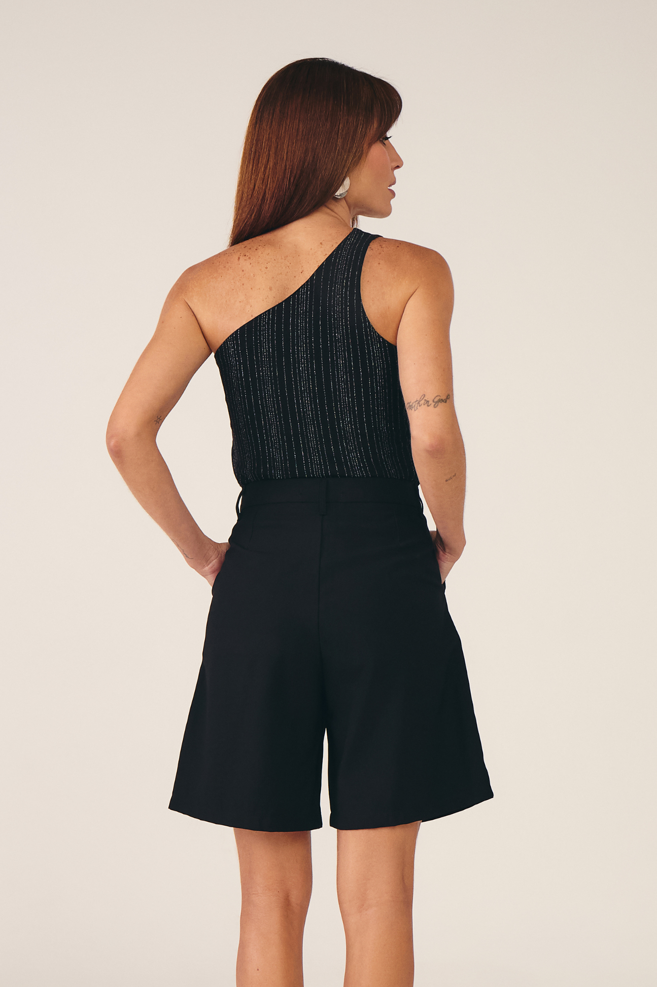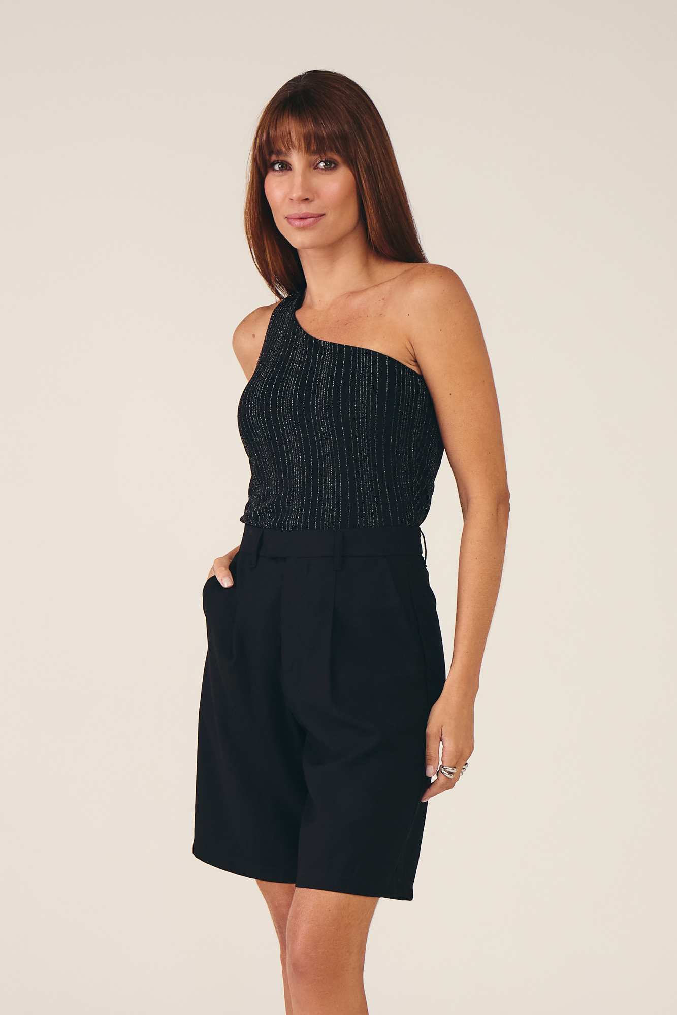 Moderna e elegante, a regata de um ombro só é confeccionada em malha de tule com lurex, oferecendo leveza, brilho sutil e um caimento delicado. O design assimétrico valoriza a silhueta e traz um toque sofisticado, tornando a peça perfeita para composições que desejam unir estilo e leveza.