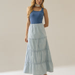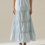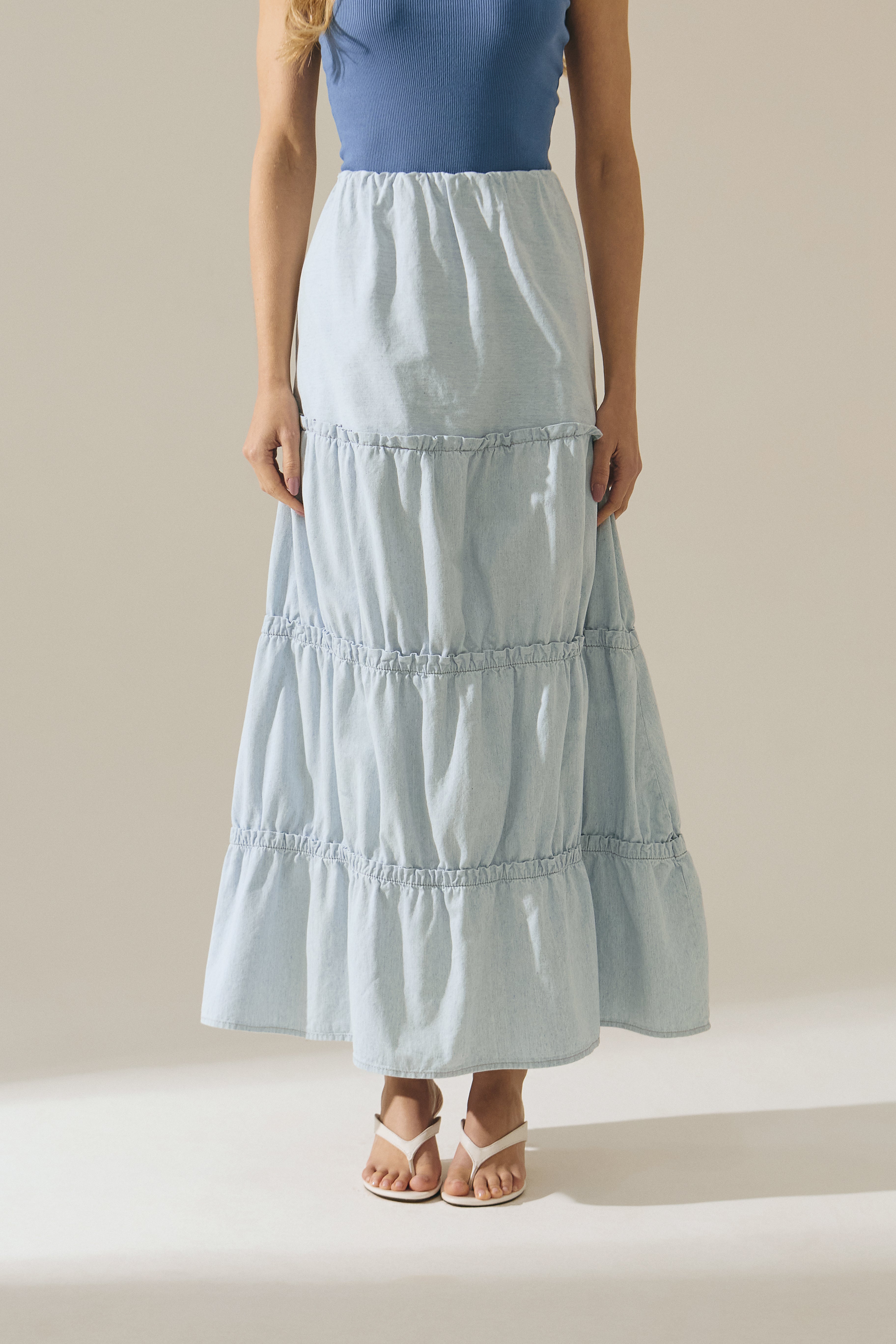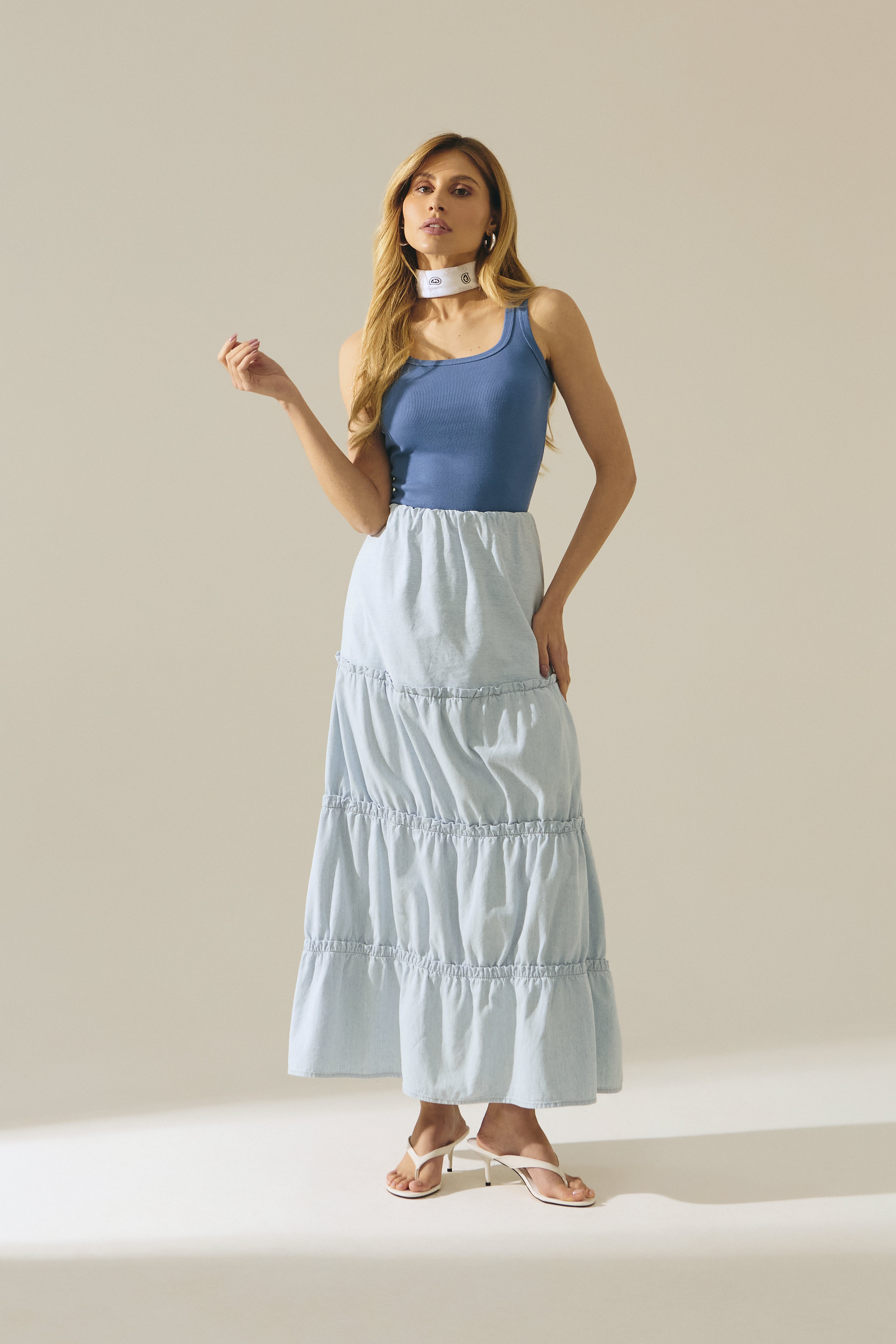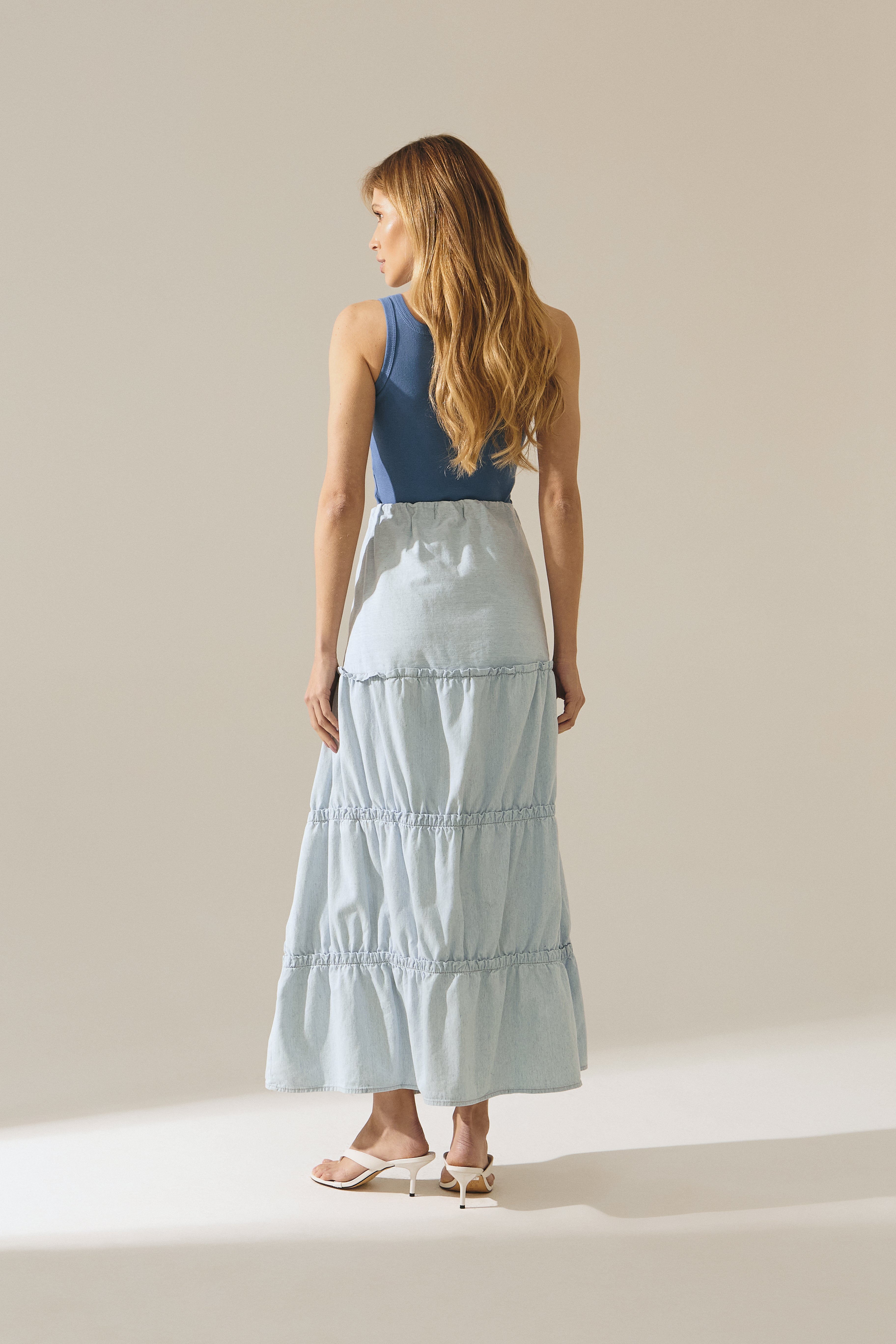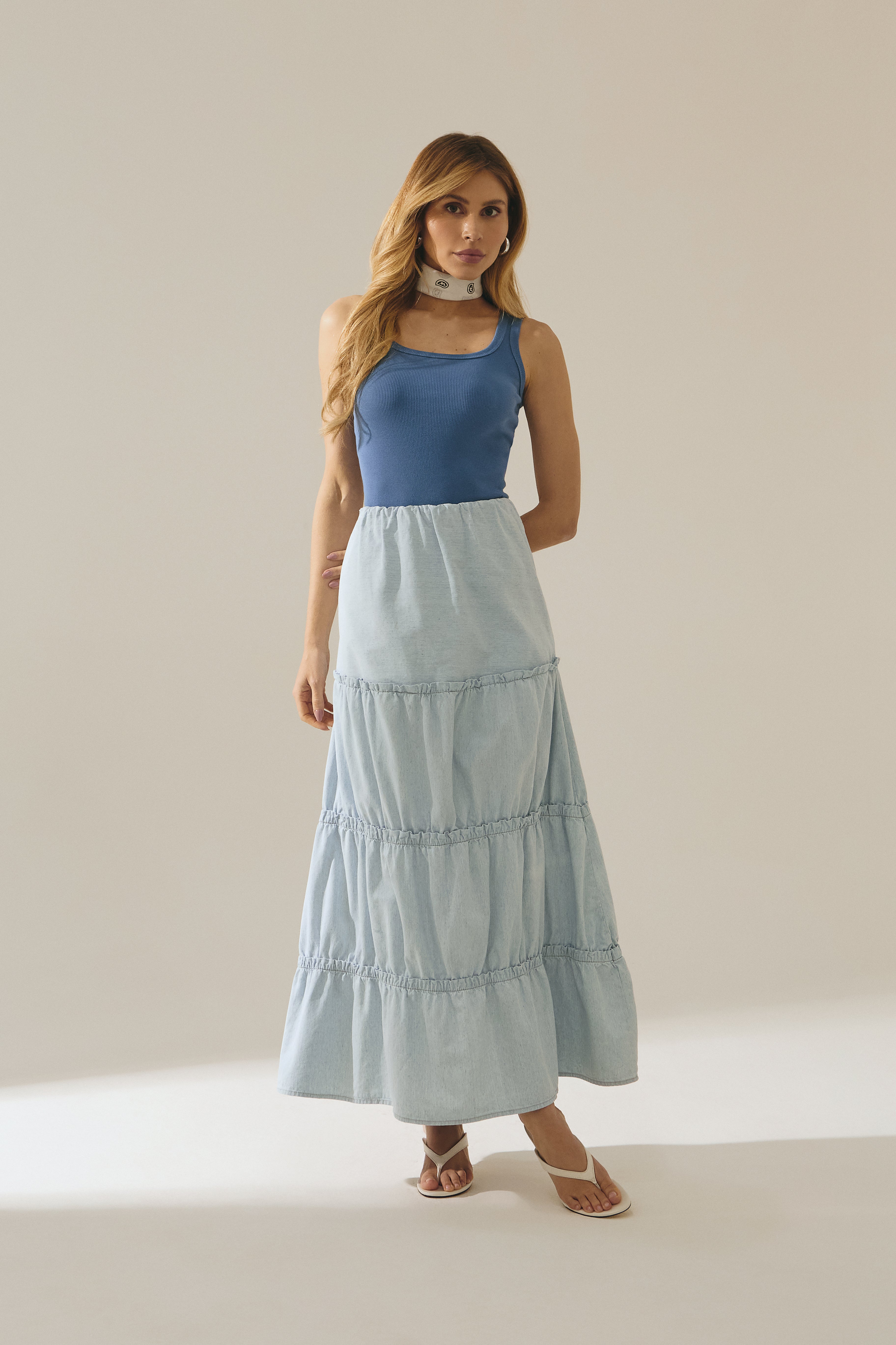 Saia longa feminina em jeans leve, desenvolvida com recortes estratégicos que valorizam o caimento e proporcionam movimento à peça. Possui detalhes de babados, que acrescentam fluidez, feminilidade e um toque moderno ao visual.