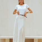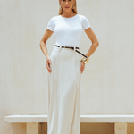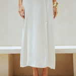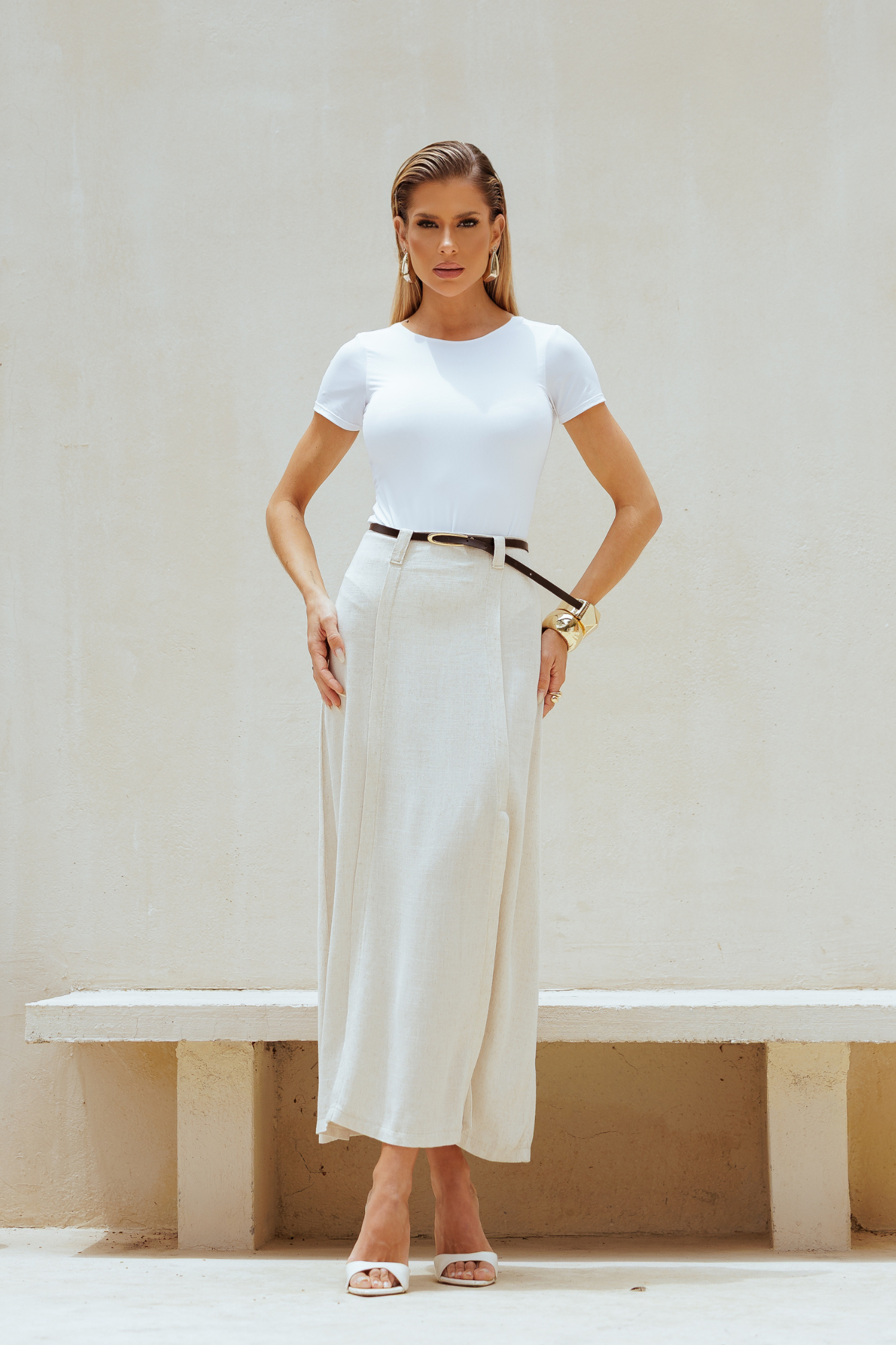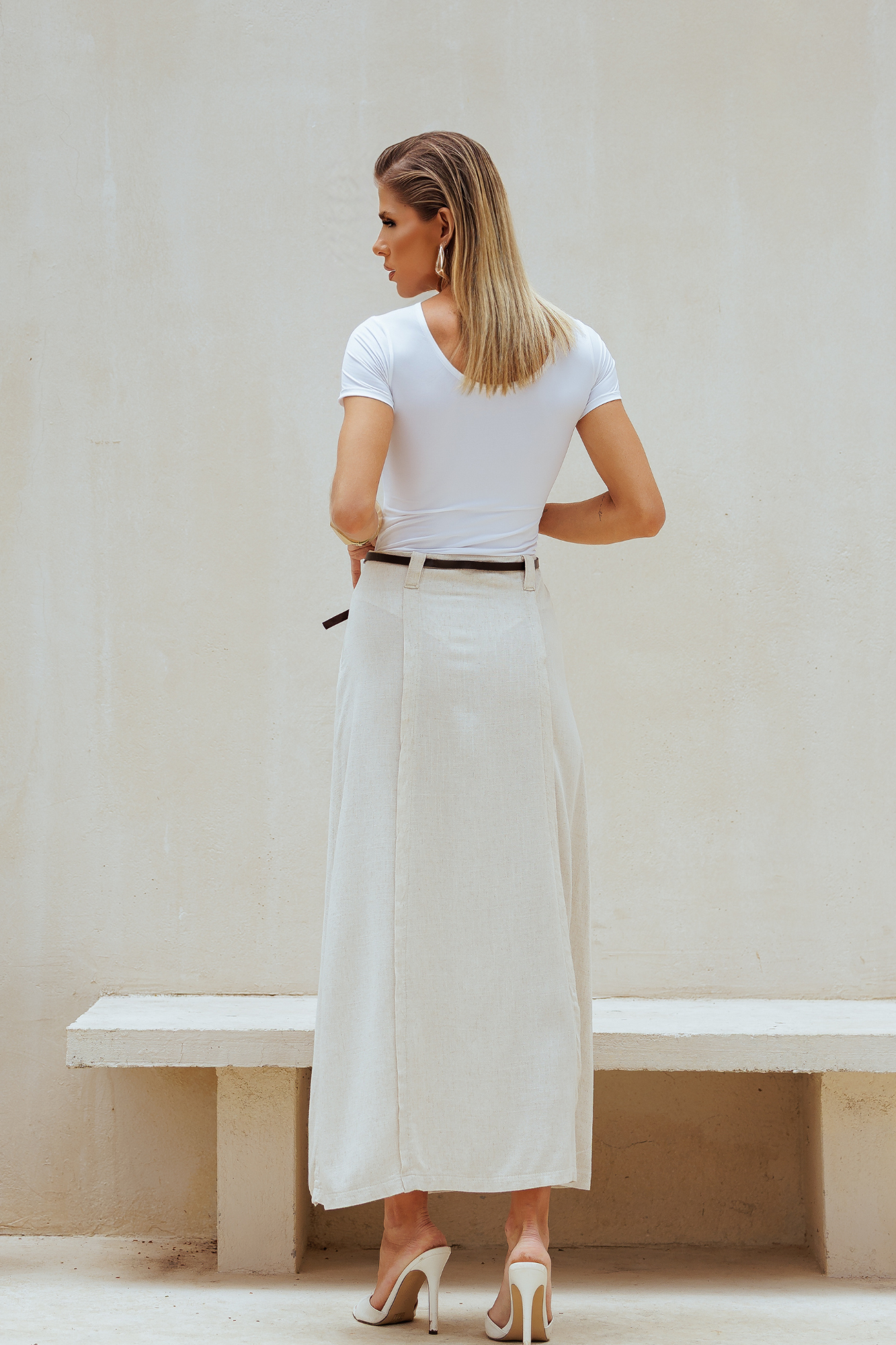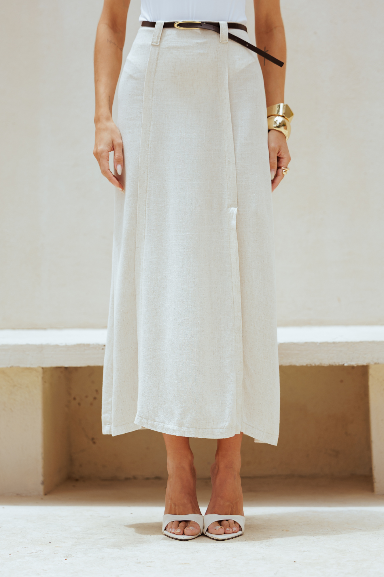 Saia midi feminina em tecido de viscose com linho. A peça conta com cinto, fechamento por zíper de nylon e detalhes de recortes com fenda, que adicionam movimento e um toque moderno ao visual. Com caimento leve e elegante, a saia é perfeita para compor produções sofisticadas e versáteis para diversas ocasiões.