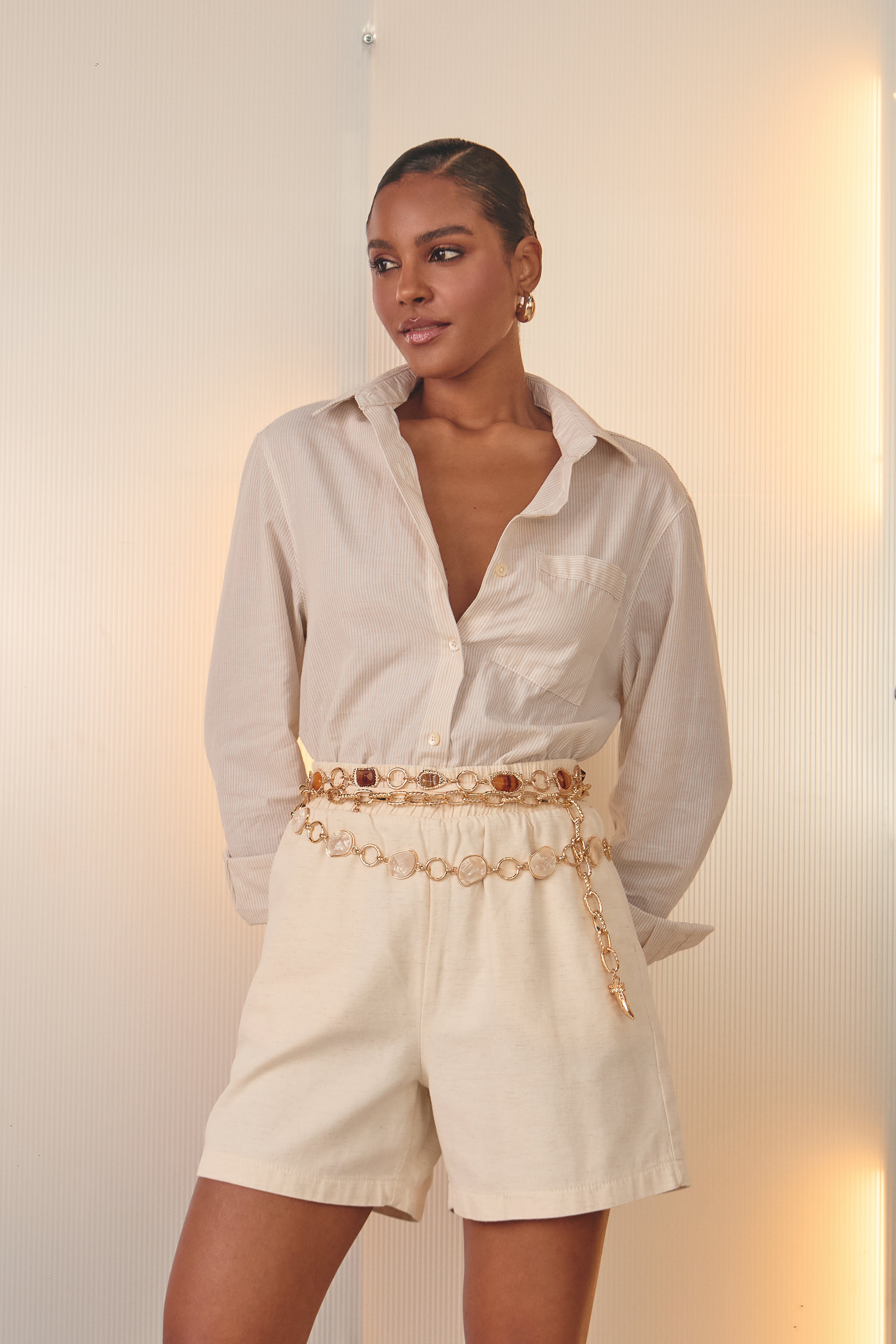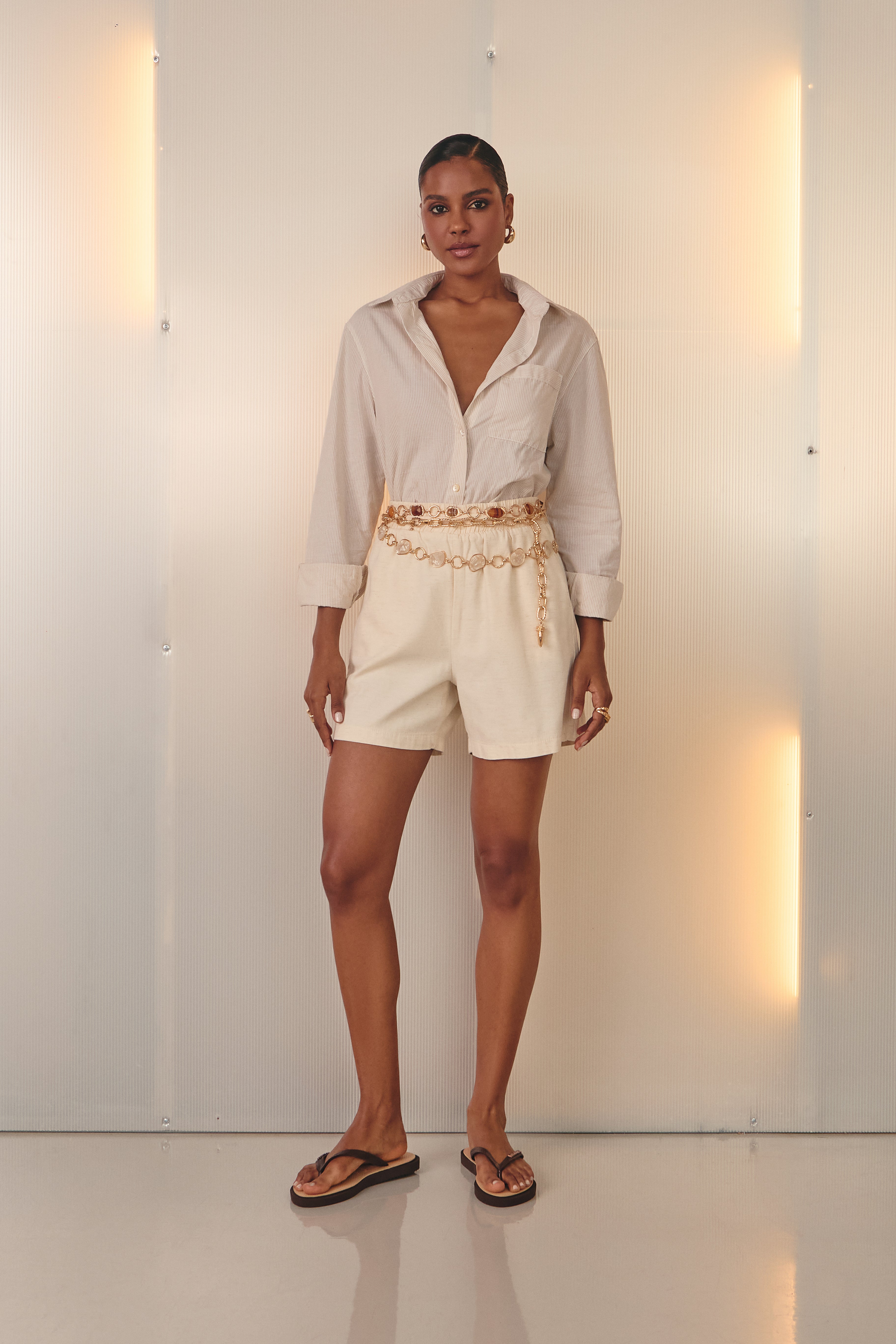 Shorts com elástico no cós. A peça possui bolsos faca frontais e cadarço para amarração, garantindo praticidade, ajuste confortável e um visual casual moderno. Com caimento leve e funcional, é ideal para compor looks versáteis do dia a dia.