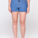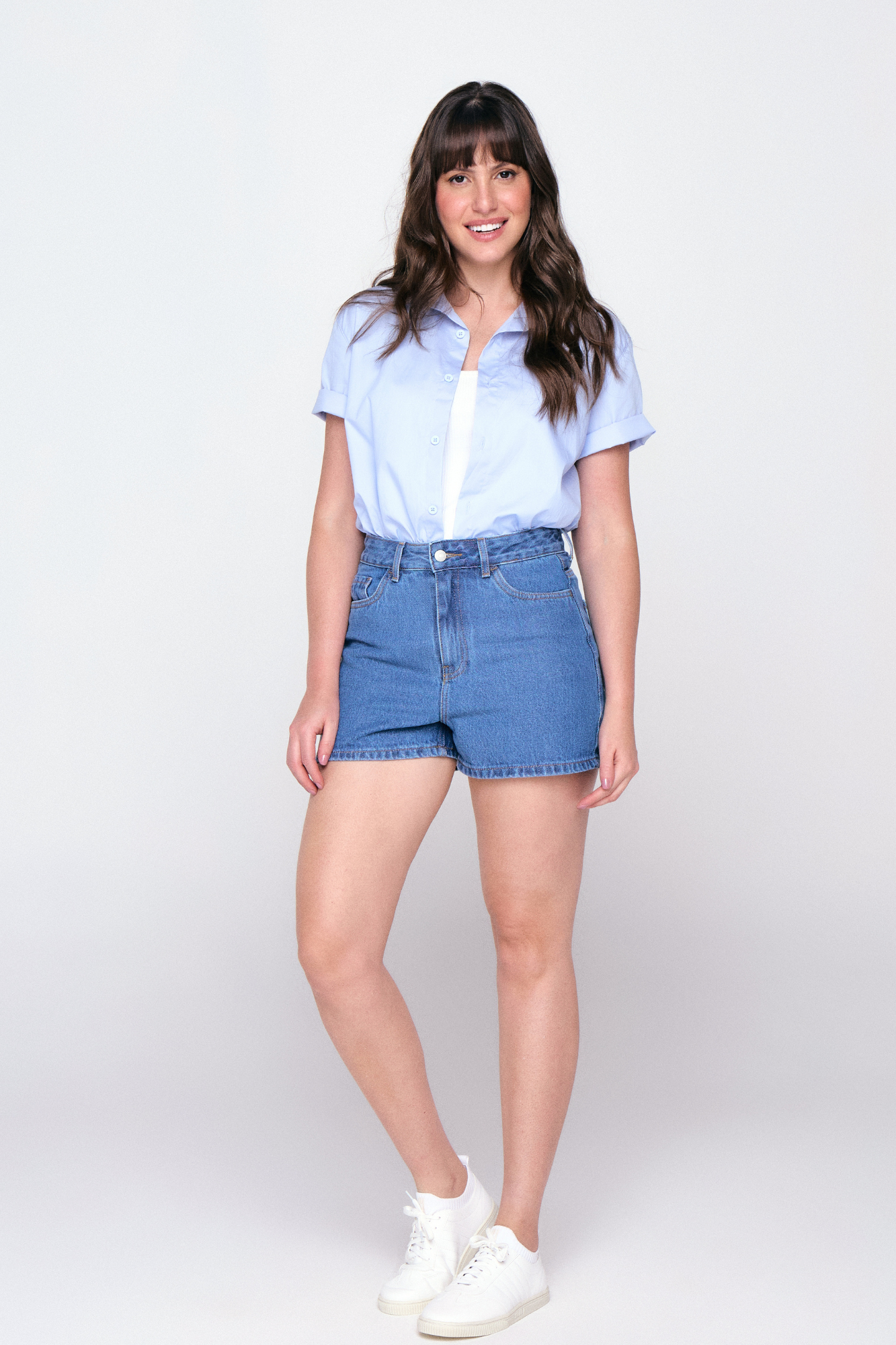 Shorts jeans mom feminino, com visual moderno e despojado. Possui cintura alta e modelagem confortável, levemente solta no quadril, garantindo um caimento natural e estiloso. Conta com fechamento por botão e zíper, bolsos frontais e traseiros funcionais.